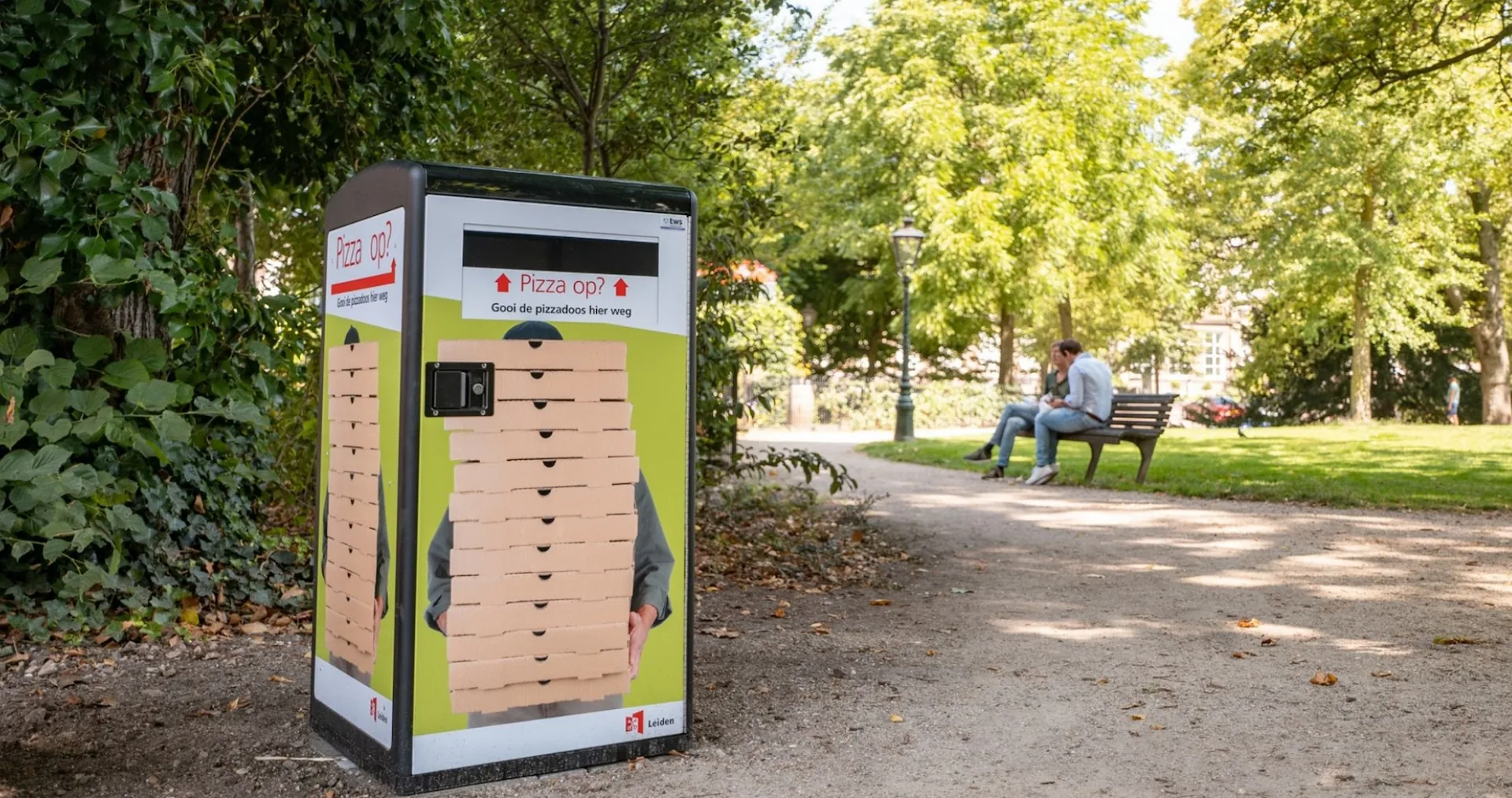 De nieuwe Bigbelly’s speciaal voor pizzadozen die de gemeente Leiden heeft aangeschaft hebben veel aandacht getrokken.