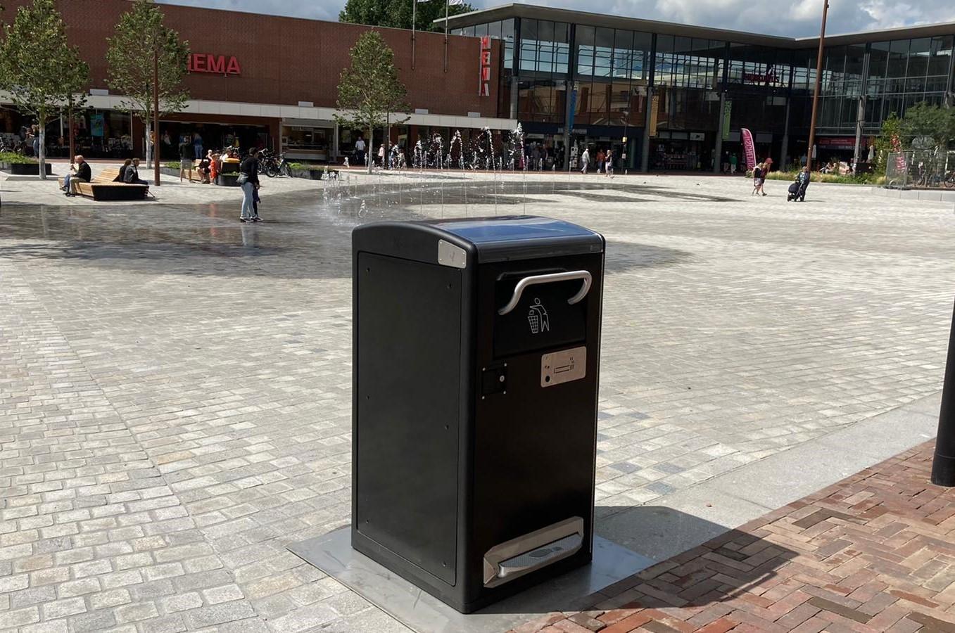 Het prachtige vernieuwde Koopmansplein in Assen is recent weer in gebruik genomen. Onderdeel van het plein zijn een drietal zelfpersende Bigbelly’s op zonne-energie waar al het afval van de bezoekers in verzameld en ingezameld wordt. Ook op 3 andere plekken zullen nog Bigbelly’s worden geplaatst, waarvan 1 met een audiospeler die een audiobericht afspeelt bij het openen.