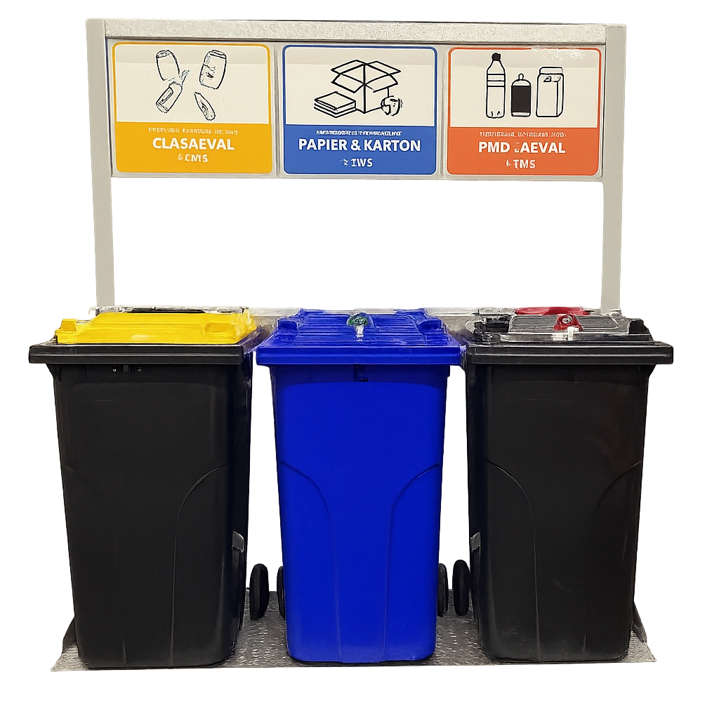 Het afvaleiland bestaat uit drie 240 liter minicontainers voor gescheiden inzameling, gecombineerd met een robuuste metalen houder en een duidelijk communicatiebord.